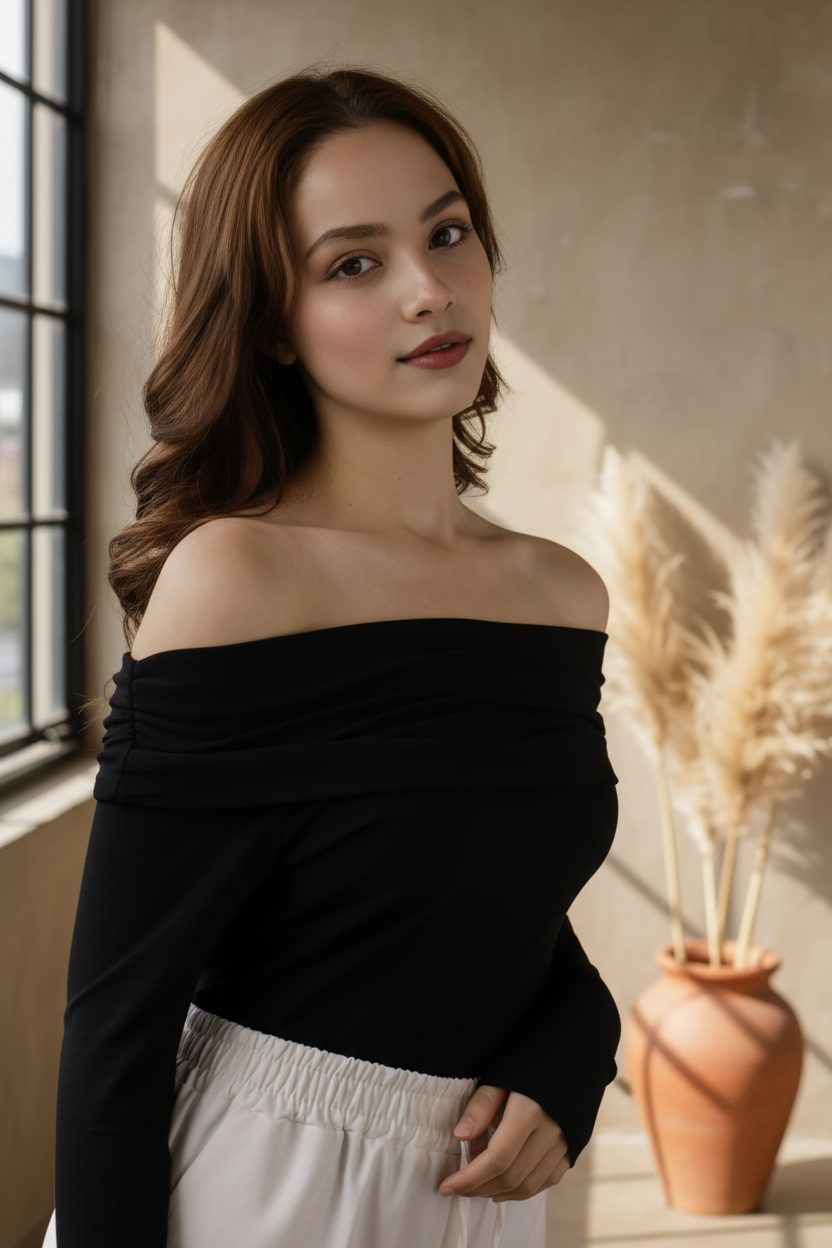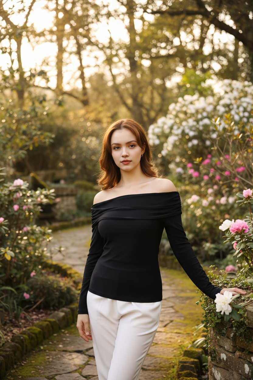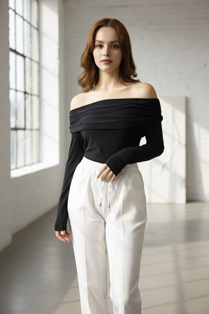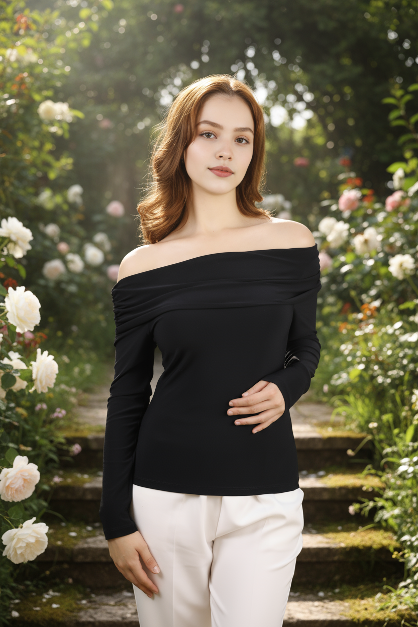 Bu omzu açık uzun kollu bluz, zarif duruşuyla günlük kullanımda da özel davetlerde de mükemmel bir tercih.